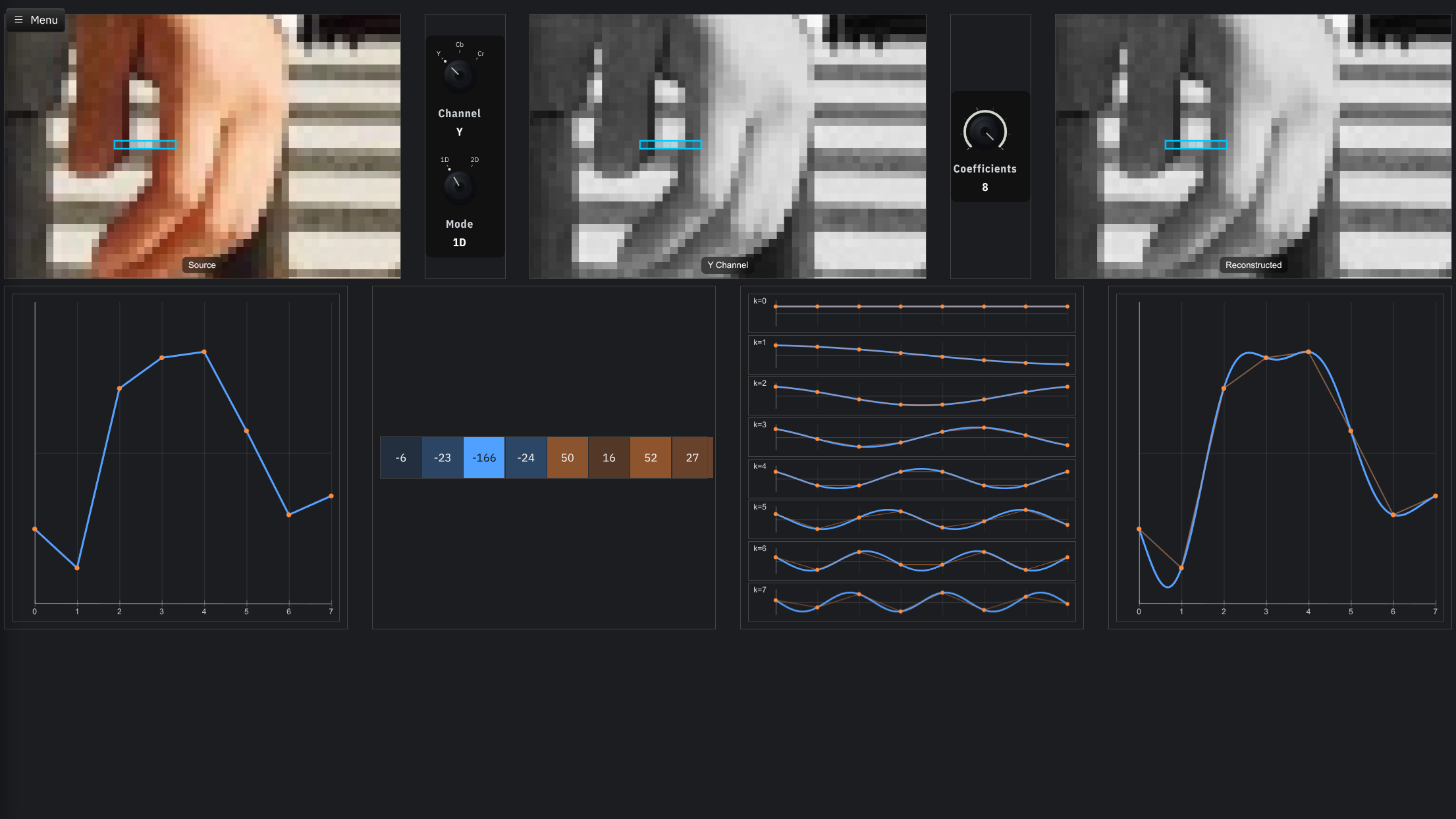 Dabei wird das Bild MCU-weise codiert. In unserem Beispiel haben wir eine MCU-Größe von 16x16 Pixeln, bestehend aus 4 Blöcken der Y-Komponente (jeweils 8x8 Pixel), 1 Block der Cb-Komponente (8x8 Pixel) und 1 Block der Cr-Komponente (8x8 Pixel), also folgende Reihenfolge: Y0, Y1, Y2, Y3, Cb0, Cr0. Wir müssen demnach insgesamt sechs 8x8-Pixel-Blöcke decodieren, um eine MCU von 16x16 Pixeln zu erhalten.