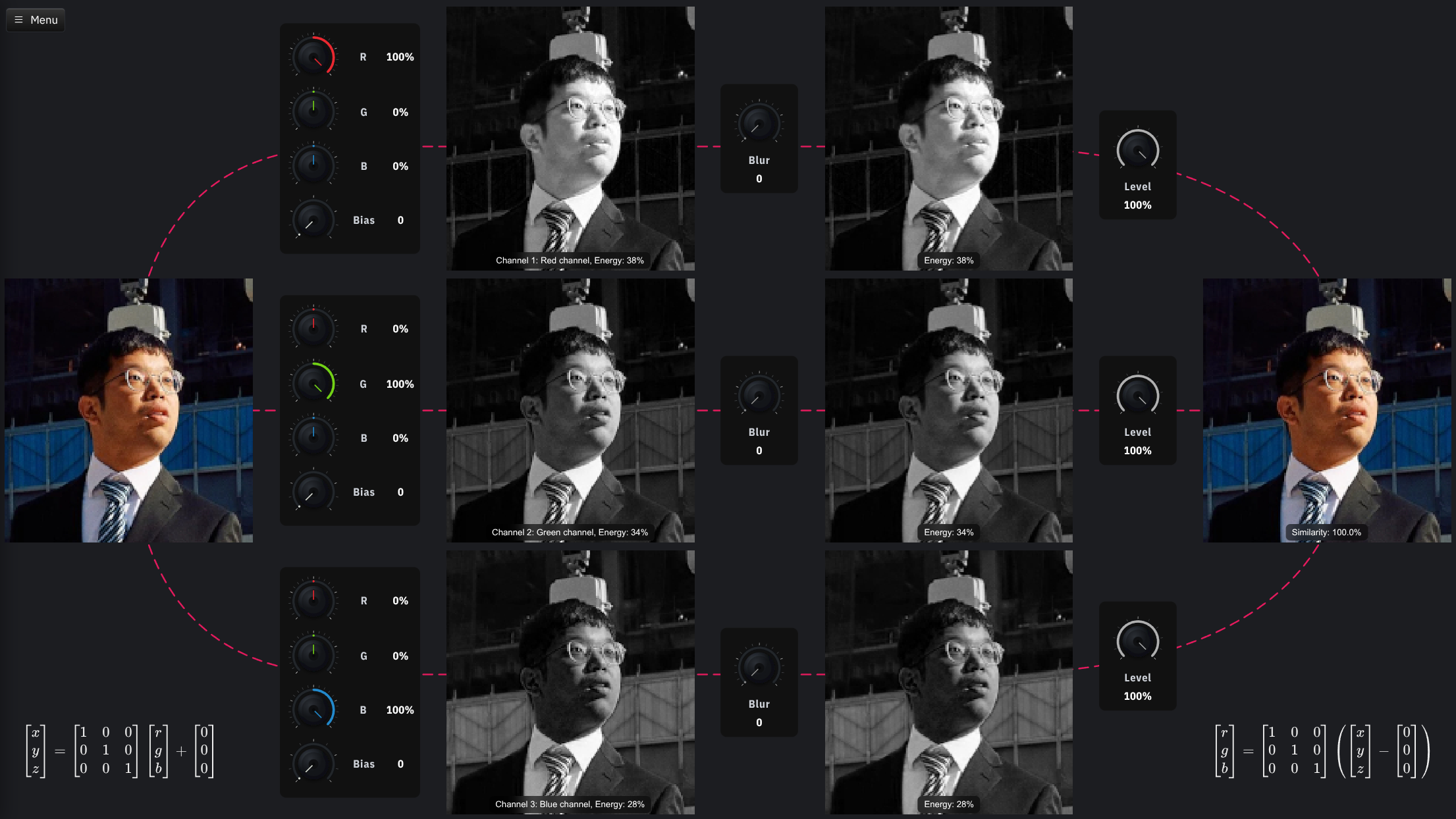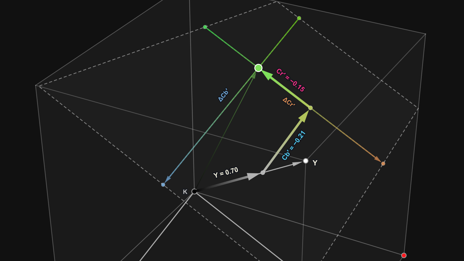 Nachdem wir die Pixelwerte für die Y-, Cb- und Cr-Komponenten erhalten haben, müssen wir diese in den RGB-Farbraum konvertieren, um das Bild korrekt darstellen zu können. Die Konvertierung erfolgt mit den folgenden Formeln: